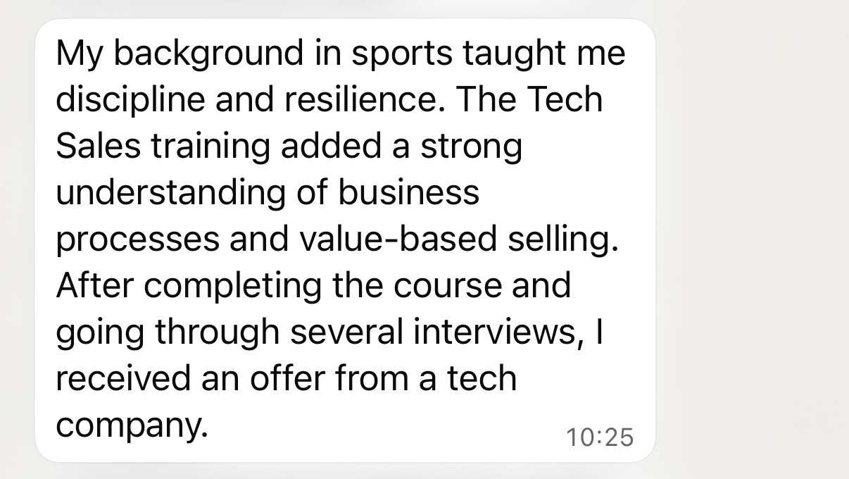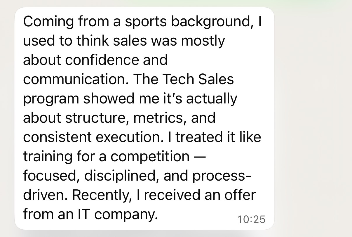 My background in athletics taught me discipline and consistency, but I lacked business knowledge. The Tech Sales course helped me understand prospecting, qualification, and stakeholder communication in a practical way. After completing the program and applying the techniques during interviews, I secured an offer in the tech industry.