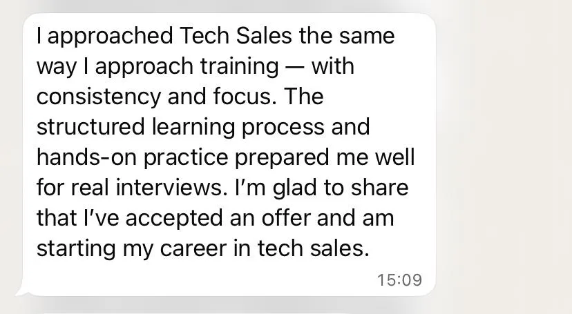 Boxing requires focus, composure, and strategic thinking — qualities that translated well into sales. The Tech Sales training helped me formalise those instincts into a clear sales methodology. After completing the course and several interview stages, I was offered a position with a growing tech firm.