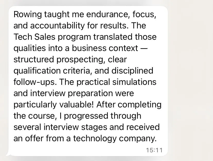 As a swimmer, I’m used to incremental improvement and performance metrics. Tech Sales mirrored that structure — measurable results, consistent outreach, and ongoing refinement. The mock calls and interview preparation were especially valuable. I successfully passed the recruitment process and received an offer.